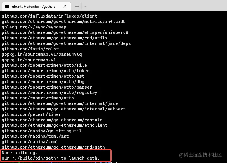 sudo cp ./build/bin/geth /usr/local/bin - 测试geth是否安装成功: