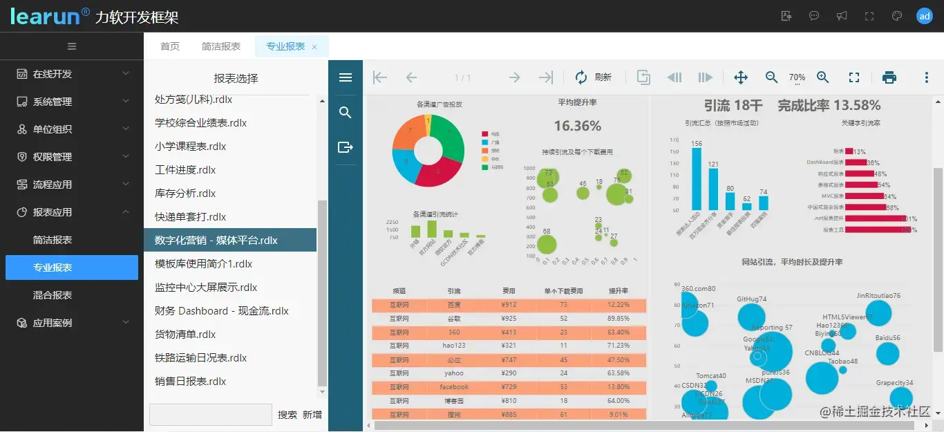 LeaRun低代码开发平台是拥有一款强大的报表开发和系统搭建工具,提供丰富的组件生成不同类型和功能的报表,既能与开发的软件项目紧密集成,也可独立部署运行,支持多数据源,具有个性化、灵活、稳定等特性,可以实现各类报表的设计、管理、权限控制、数据填报,大大简化前后端的报表开发成本。