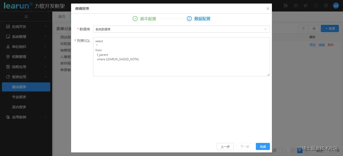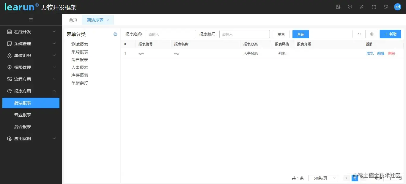 LeaRun低代码开发平台的报表应用目录下选择自己所需要设计的报表类型,如只是需要功能相对简单的简洁报表,点击新建后,进行报表编号、名称、分类、风格等基本信息配置填写。