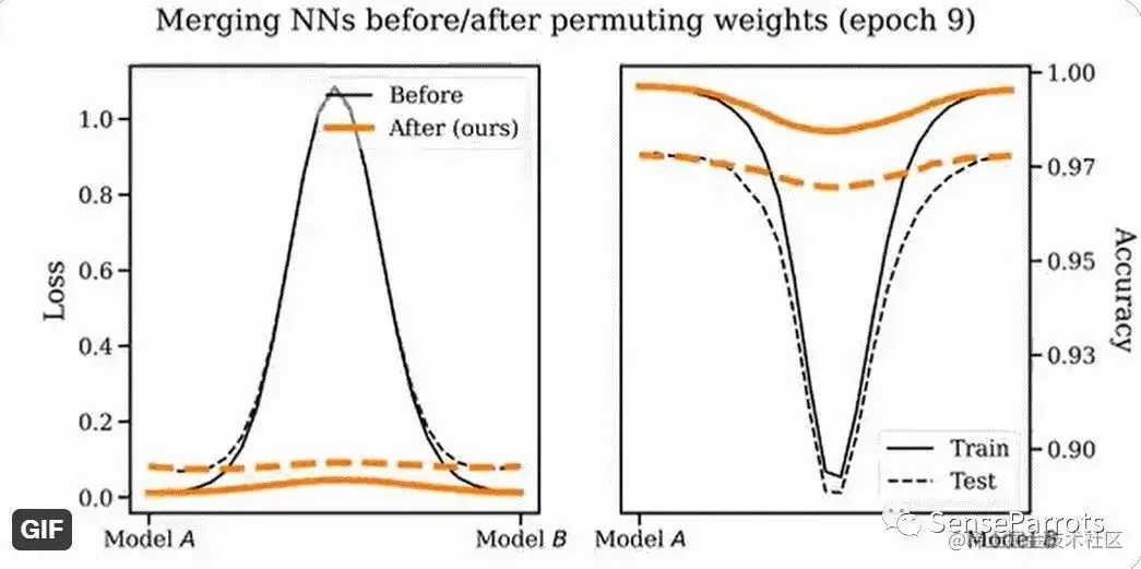 Samuel K等人[3]用置换对称性的方式零障碍合并两个模型,实现几秒内大型ResNet模型线性连接。在考虑了隐藏单元所有可能的排列对称性之后,神经网络损失图谱包含(几乎)一个单一的盆地。研究人员引入了三种算法来置换一个模型的单元,使它们与参考模型的单元对齐。这种转换产生了一组功能等效的权重,它们位于参考模型附近的近似凸盆中。在实验上,他们通过各种模型架构和数据集展示了单盆地现象,包括首次(据我们所知)在 CIFAR-10 和 CIFAR-100 上独立训练的 ResNet 模型之间的零障碍线性模式连接演示。