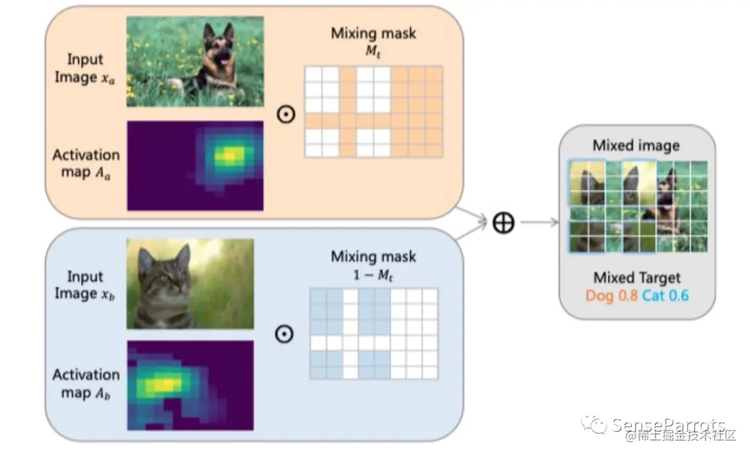 近日,MMLab和商汤提出了token混合(TokenMix)[2],这是一种token级增强策略,可以很好地推广到各种基于transformer的架构中。TokenMix的动机是两个关键观察结果:1)区域级混合对基于Transformer的架构不太有利,2)使用线性组合分配混合图像的目标可能不准确,甚至违反直觉。 作者提出的TokenMix直接在token级别进行切割,并使用基于内容的神经激活映射获得混合图像的目标。实验结果表明,TokenMix具有增强遮挡鲁棒性和帮助视觉Transformer聚焦输入图像前景区域的特性。此外,TokenMix不断改进各种基于transformer的架构,包括DeiT、PVT和Swin transformer。