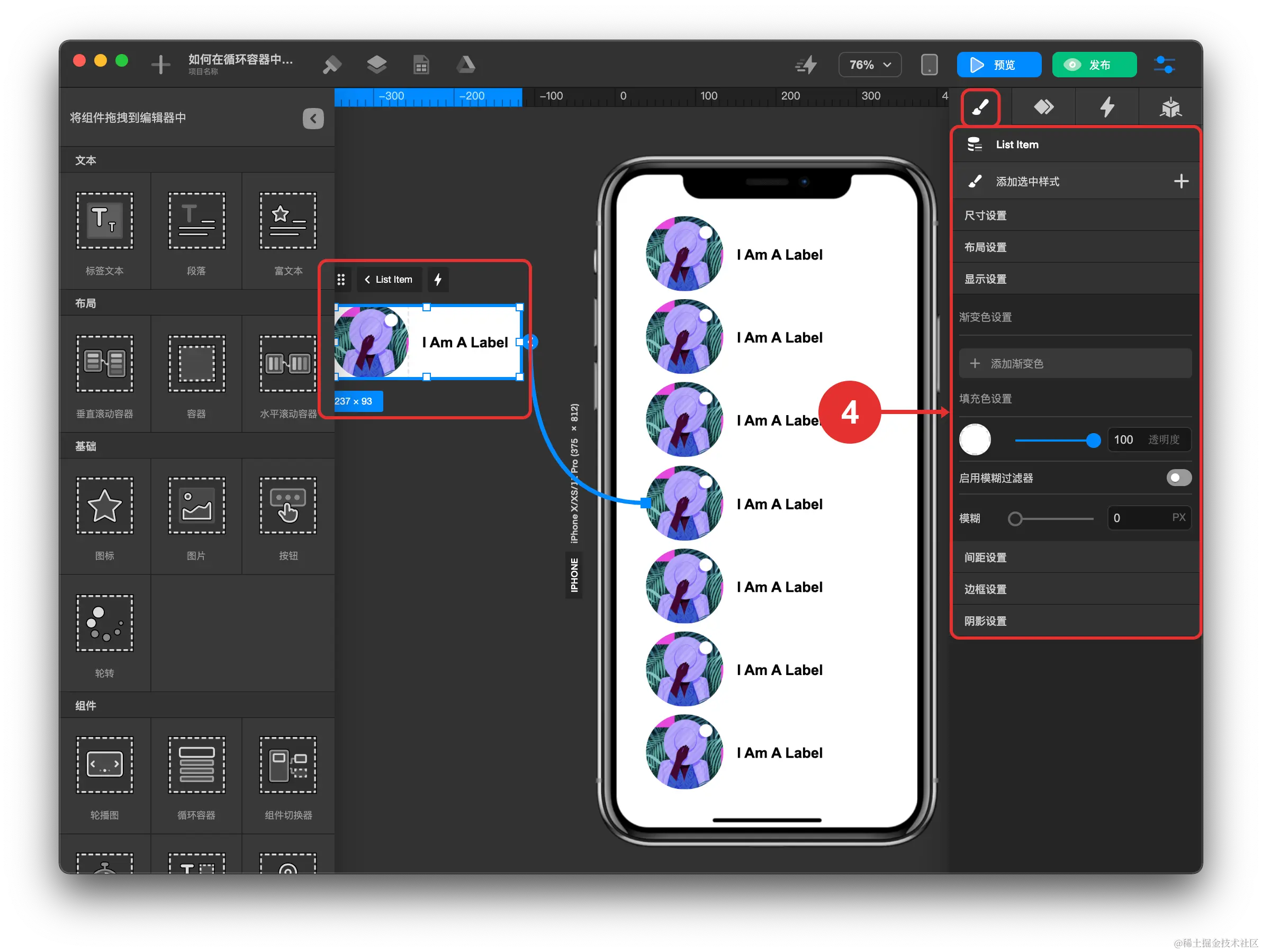 - 添加文本组件 ,拖拽到循环容器条目区域