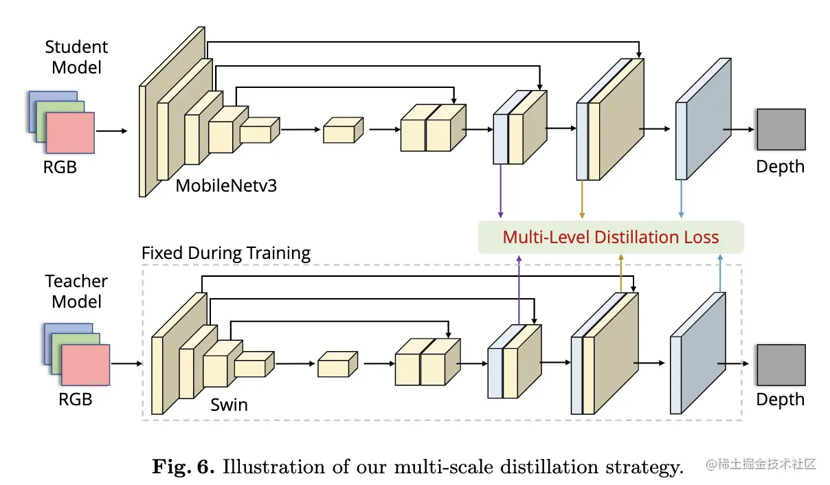论文摘要:单眼深度估计是计算机视觉界的一项重要任务。虽然很多成功的方法都取得了很好的效果,但它们中的大多数都是计算昂贵的,而且不适用于实时的设备推断。在本文中,我们的目标是解决单眼深度估计的更多实际应用,其中的解决方案不仅要考虑精度,还要考虑移动设备上的推理时间。为此,我们首先开发了一个基于端到端学习的模型,其权重大小很小(1.4MB),推理时间很短(在Raspberry Pi 4上为27FPS)。然后,我们提出了一个简单而有效的数据扩充策略,称为R2 crop,以提高模型的性能。此外,我们观察到,只用一个单一损失项训练的简单轻量级模型将遭受性能瓶颈。为了缓解这个问题,我们采用了多个损失项来在训练阶段提供足够的约束。此外,通过一个简单的动态再加权策略,我们可以避免耗时的损失项的超参数选择。最后,我们采用了结构感知的蒸馏法来进一步提高模型的性能。值得注意的是,我们名为LiteDepth的解决方案在MAI&AIM2022单眼深度估计挑战赛}中排名第二,si-RMSE为0.311,RMSE为3.79,在Raspberry Pi 4上测试的推理时间为37ms。值得注意的是,我们提供了该挑战的最快解决方案。代码和模型将在 github.com/zhyever/Lit… 上发布。
