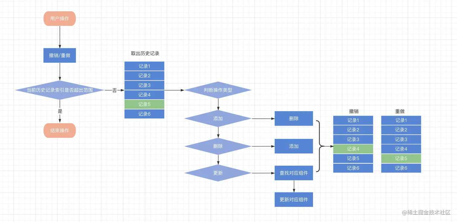 首先,不管是撤销还是重做都是需要判断当前历史记录的索引是否超出了其数组长度,如果超出了,我们是不能进行操作的。当索引未超出时,我们取出对应的记录,图中为记录5。此时,你的记录信息中应该有一个操作类型标识,你可以称其为ActionType,值为: