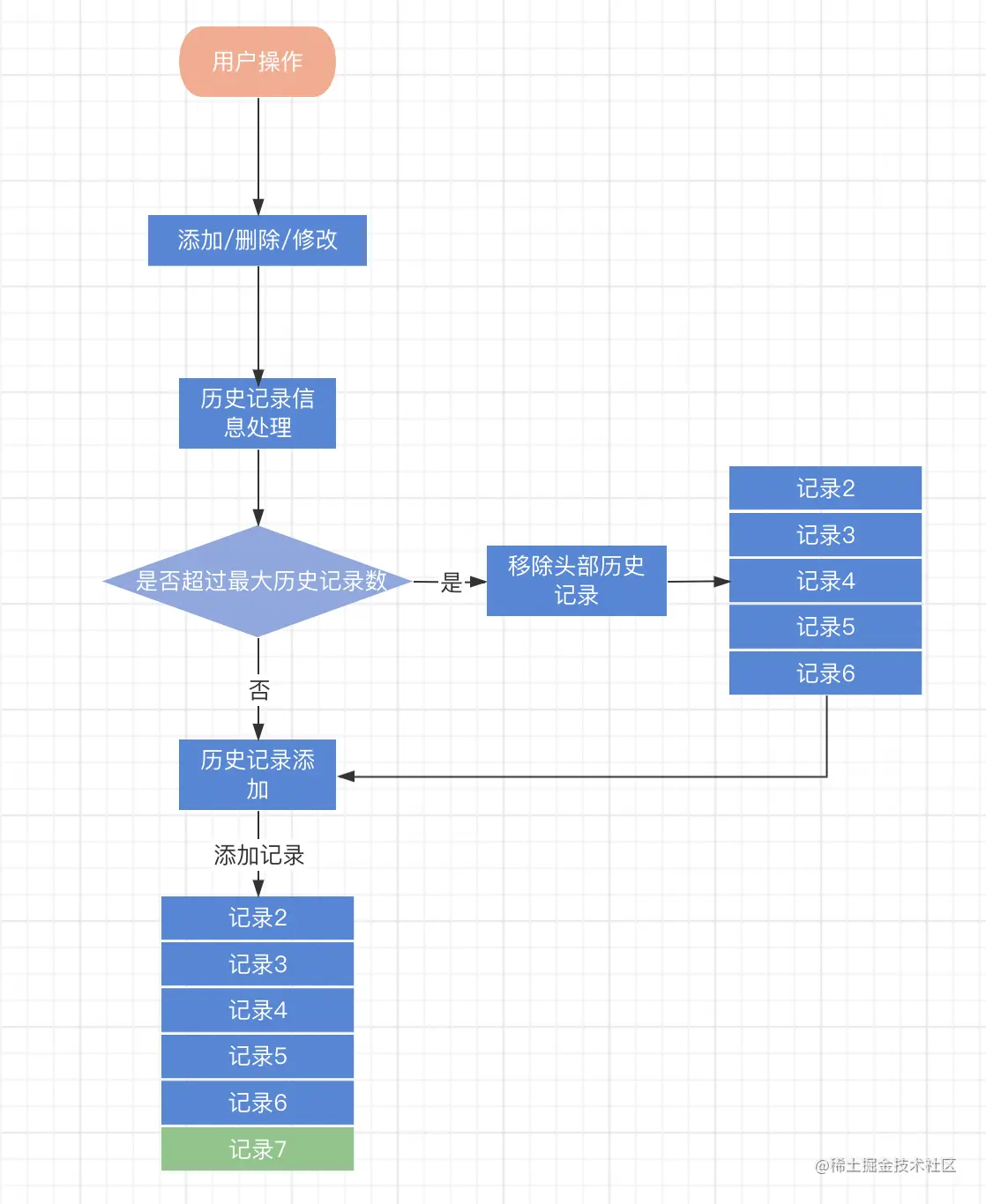 我们可以看到,用户会有三种操作:添加/删除/修改,当操作触发时,我们需要对存入历史记录的信息做一些处理,这些处理通常会包含一些数据格式的转换,处理完之后,我们需要判断当前的历史记录数是否超过了最大值,如果没有超过,我们就可以直接将记录push到数组中,否则我们需要使用shift方法移除数组头部的项,也就是图中缺少的记录1,然后将记录push到数组中。