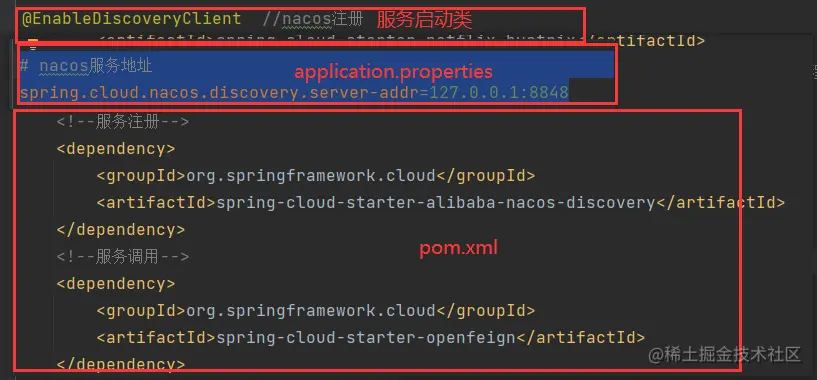 如下图,pom.xml文件中的依赖,application.properties中注册中心的配置,服务启动类的注解,三者缺一不可