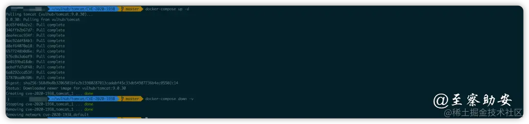 本次使用CVE-2020-1938为例,进入到相对应的文件夹后,编译完环境后使用docker-compose up –d启动命令会根据该文件夹中的docker-compose.yml定义将相应的镜像拉取到本地,并且会自动启动容器以及进行必要的端口映射。