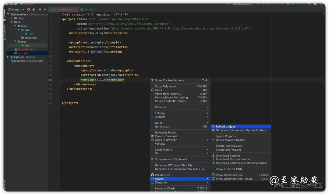这里以搭建Fastjson 1.2.24之前版本的反序列化漏洞环境,需要引入版本小于1.2.24的Fastjson组件为例,引入Fastjson相应版本后右键单击pom.xml文件选择“Maven”选项,进行组件的自动获取。