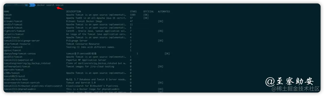 search命令可以搜索指定名称和仓库的镜像,例如搜索tomcat的镜像