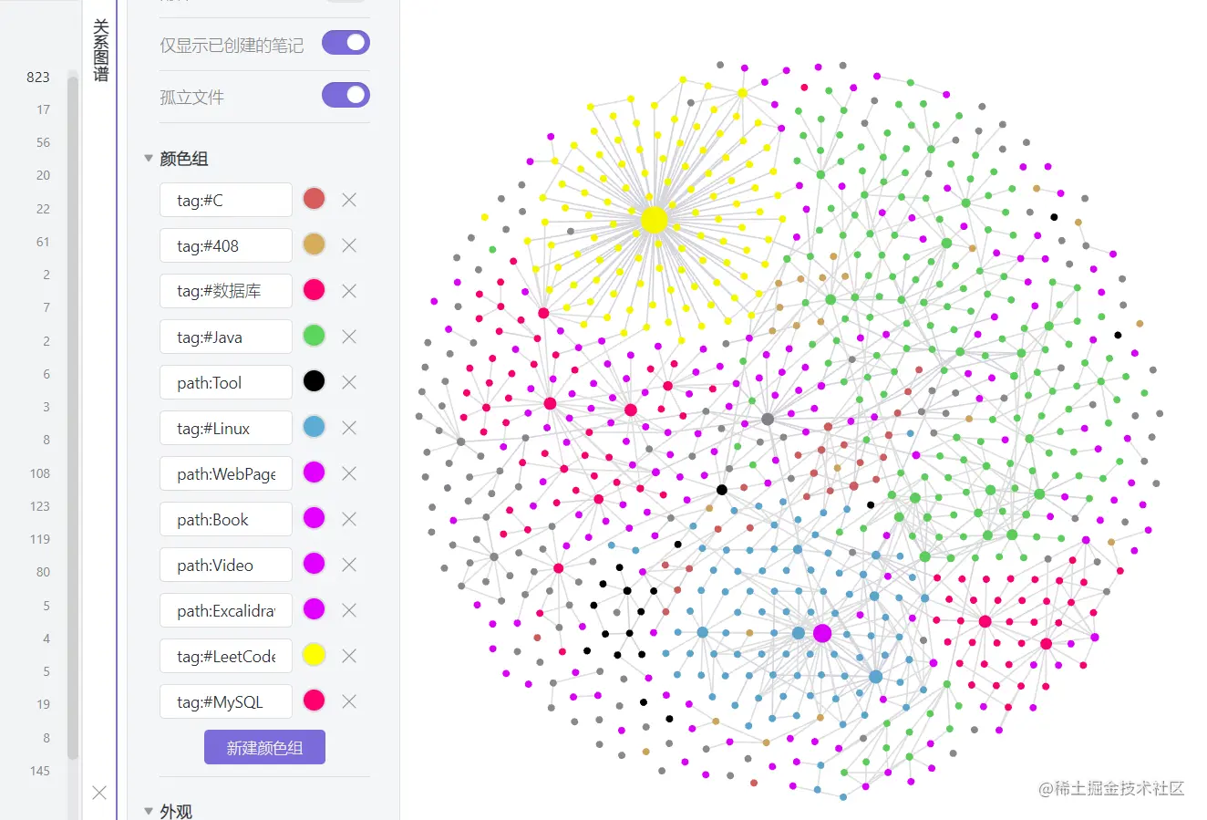 目前我已经使用了此学习流稳定输出了 823 篇笔记,累计使用时间为 6 个月,通过以下笔记的 关系图谱 可以看到我写的所有笔记之间的联系,并且可以看出我对不同领域的积累量(看笔记的数量,一个点代表一篇笔记)