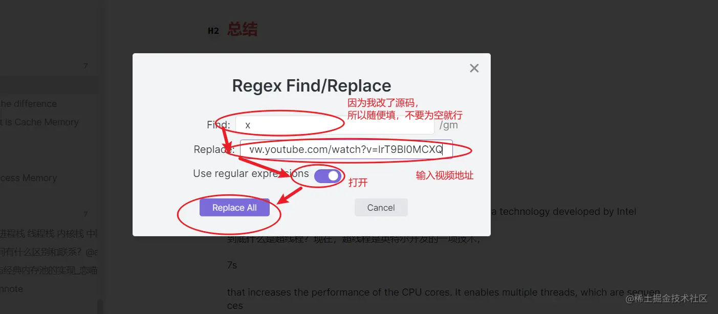 回到刚刚新建的笔记,按 ctrl + alt + f 进行正则替换:
