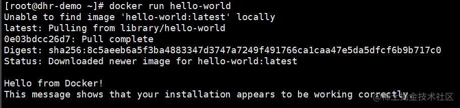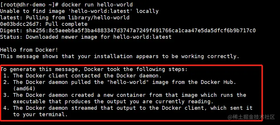 当我们运行hello-world镜像时,会看到终端显示了一段话,如下图中红框中的内容: