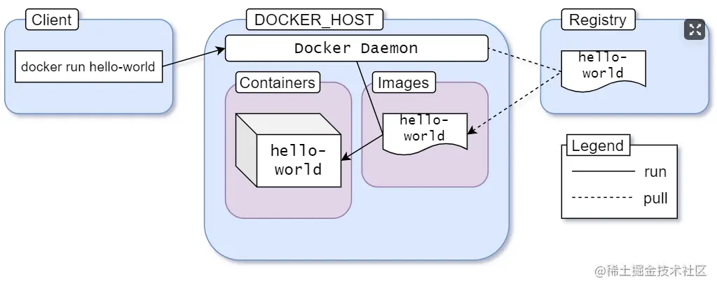 Docker Client执行docker run命令时,会与Docker daemon通信,该进程会去检查本机是否已经下载了hello-world镜像。如果没有,它会从Docker Hub镜像仓库拉取该镜像。镜像被下载到本机后,Docker daemon会基于这个镜像创建一个容器,然后容器内会运行可执行文件输出内容。Doceker daemon会将输出内容发送给Docker客户端,最终,内容会被显示到终端显示器。