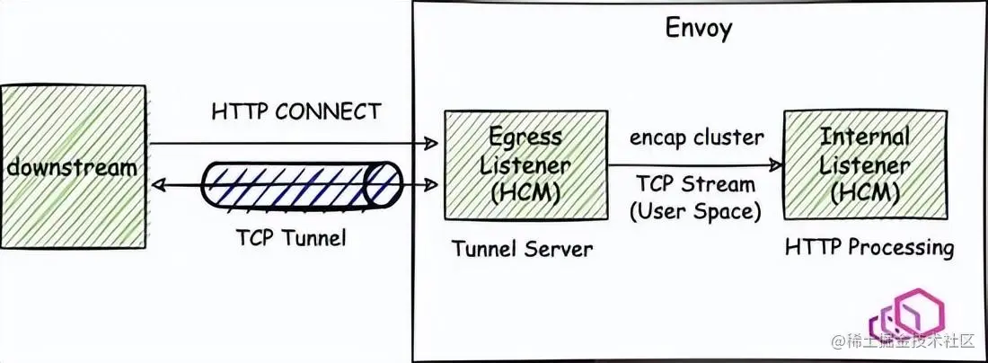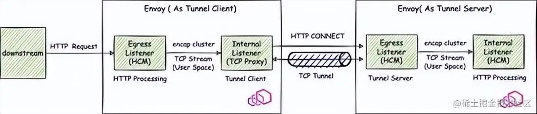 Envoy 来作为 HTTP Proxy 来接收 HTTP CONNECT 请求,我们和客户端建立 HTTP 隧道。Envoy 不能在同一个 Listener 里面建立隧道,然后从 HTTP 数据隧道中解开出来。要实现这一点,我们负责两层数据流的HCM侦听器,负责创建HTTP隧道并从隧道中的TCP数据流中,然后CO侦听器需要TCP侦听器中的数据流向HCM中的第一个侦听器进行处理。