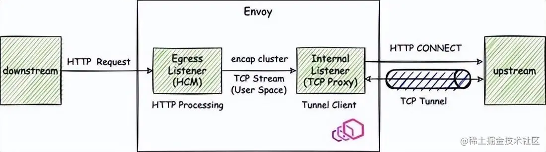 我们可以采用 Envoy 来作为客户端创建一个到 HTTP Proxy 的 HTTP Tunnel,也可以采用 Envoy 来作为 HTTP Proxy 服务器接收客户端的 HTTP CONNECT。