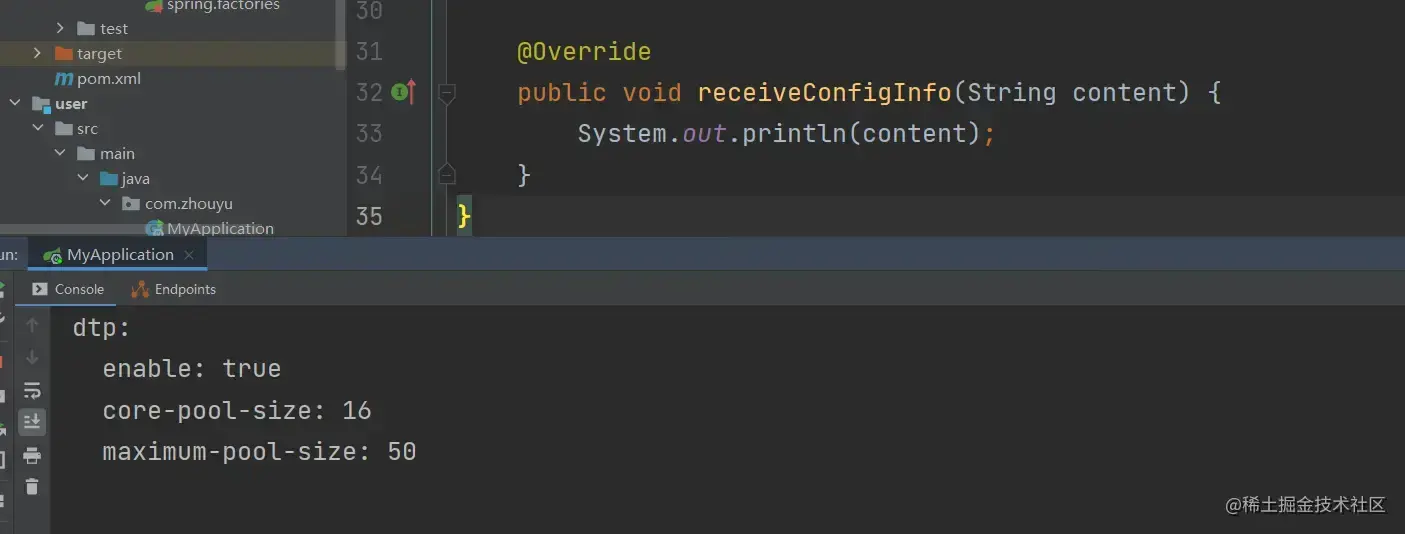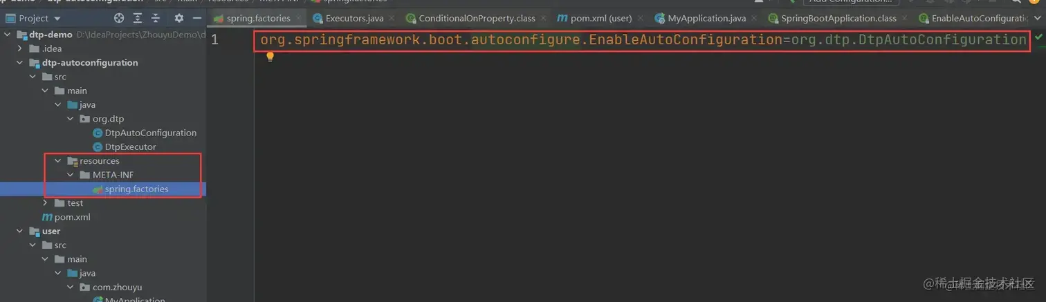 我们先来测试一下,注意DtpAutoConfiguration自动配置类要能够生效,还需要利用spring.factories: