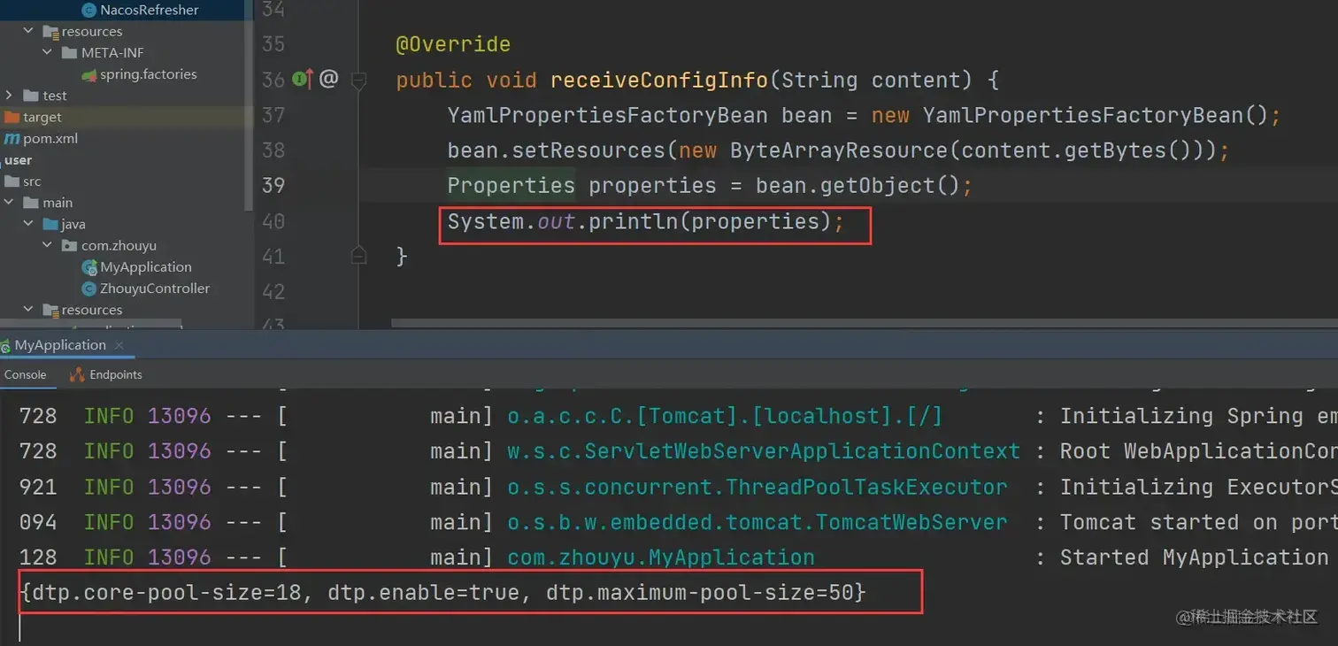 这样就完成了DtpExecutor的参数修改,到此,一个简单的动态线程池就完成了,大家可以自行测试一下,修改Nacos配置,看controller那边能不能实时拿到最新的corePoolSize,我测是没问题的。