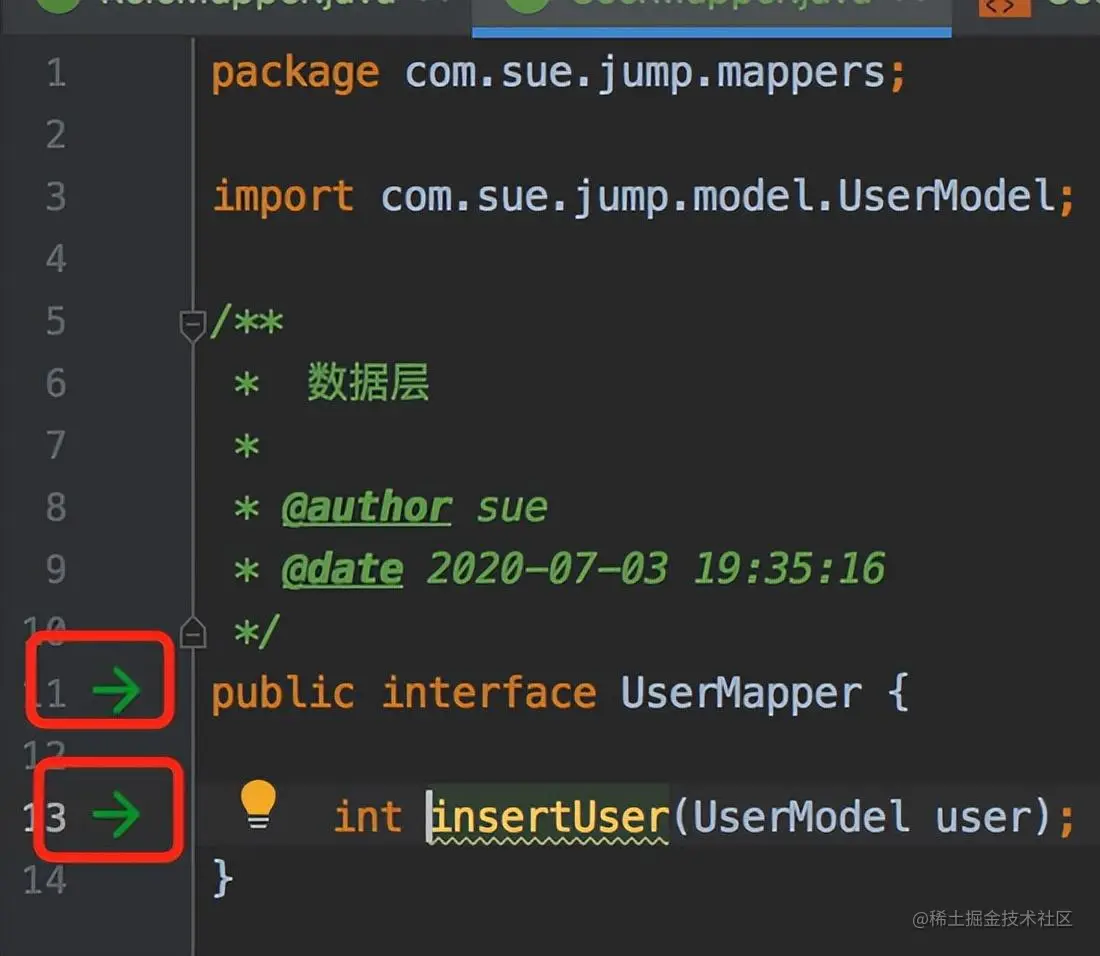 安装了该插件之后,在UserMapper接口的接口名和方法名的左边,会多了两个绿色的箭头,我们点击该箭头,就能跳转到UserMapper.xml文件对应的mapper标签或者insertUser语句上。