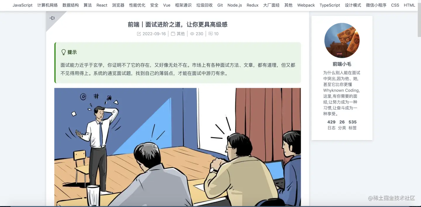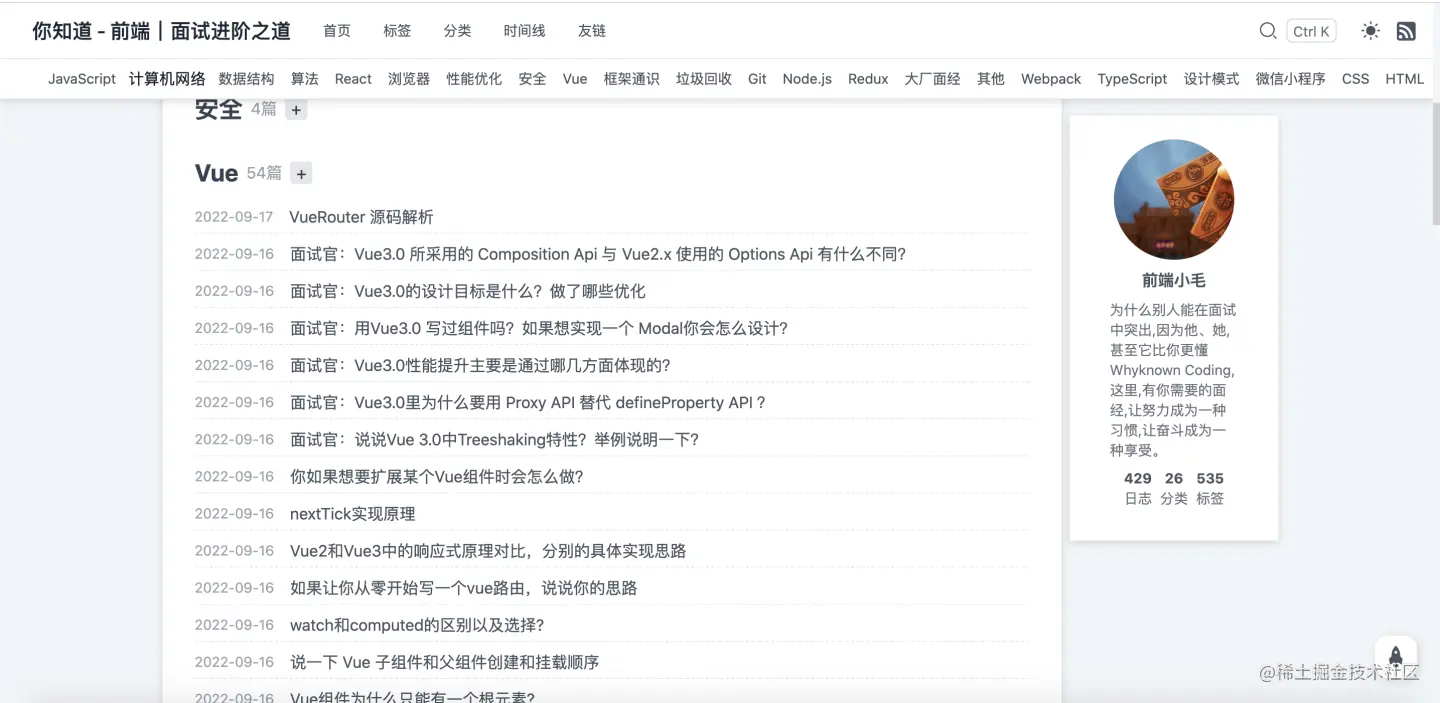 你不知道的前端面试宝典,秒杀牛客赛马网 whyknown 2022-09-20 337 阅读1分钟 > 你知道 - 前端|面试进阶之道 废话不多说,直接上图 网站界面简单,知识点进行分类处理 针对经典的面试题进行专业回答 页面快到极致的响应速度,Lighthouse 接近满分 你知道 - 前端|面试进阶之道 www.whyknown.com/