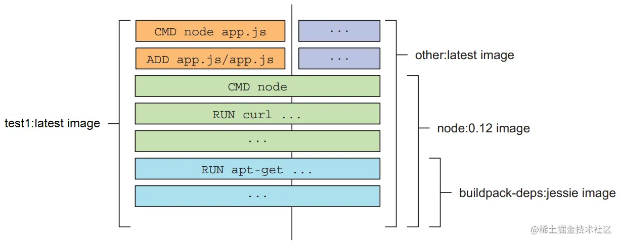 other:latest的镜像是与我们自己构建的镜像test1:latest共享Node.js的所有层。