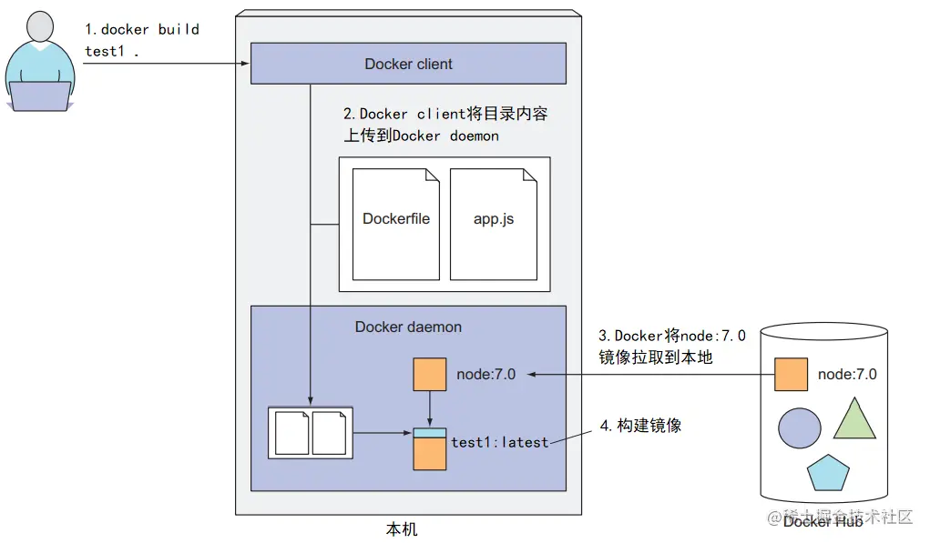 在构建的过程中,Docker会从公共镜像仓库(Docker Hub)拉取基础镜像(node:7),除非这个镜像已经被拉取且存到本机上了。