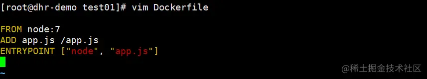 这个文件就是一个指令清单,指示Docker在构建镜像时需要执行的命令。Dockerfile需要和app.js文件在同一个目录下,而且应该包含如下命令: