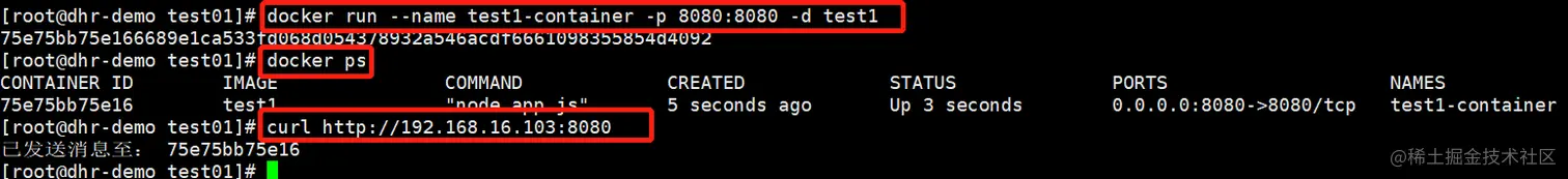 该命令会告诉Docker通过test1镜像启动一个叫做test1-container的容器。-d标志表示容器与终端脱离,也是就容器会在后台运行。本机的8080端口与容器的8080端口映射。