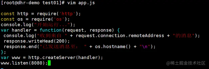 该程序会启动一个监听8080端口的HTTP服务。当收到来自外界的消息后,请求处理器会记录并输出请求方的IP地址,然后给每一个请求返回状态码200以及一段包含主机名的文本。
