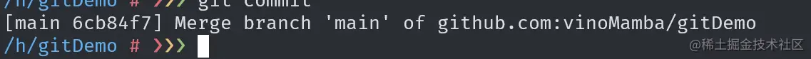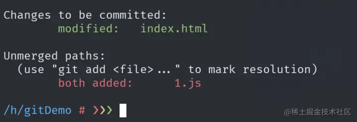 这里文件内容较少,冲突显而易见。如果代码过多的时候。通过搜索==== 来定位冲突。等号上面的是本地代码。等号下面的时候拉取的代码,跟进实际情况进行处理即可。当然像 vs code jetbrains 这些现代化编辑器都有智能的提示,操作起来更简单。当冲突解决完毕之后,执行提交命令即可完成代码的合并。