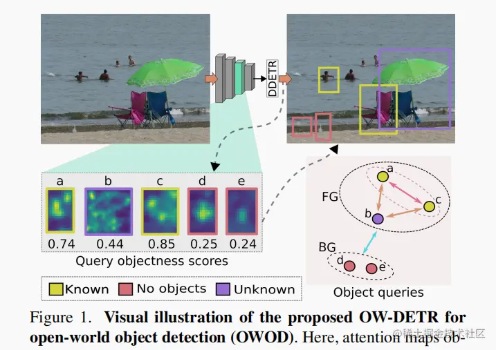图2展示了所提出的开放世界目标检测 transformer OW-DETR 的总体架构。