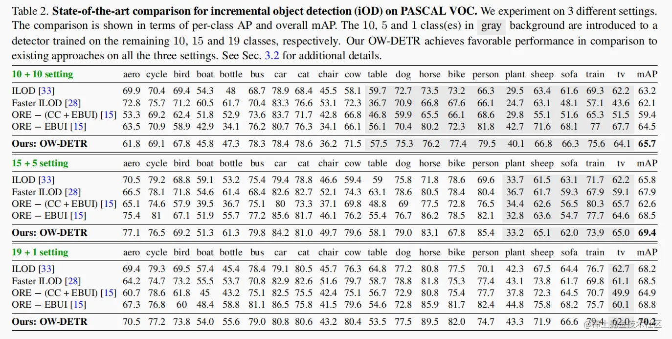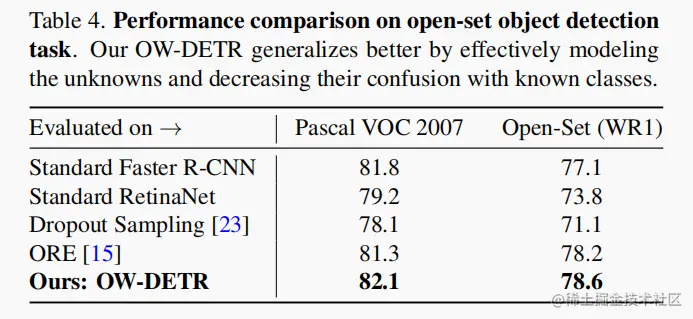 表2展示了 OW-DETR 与 PASCAL VOC 2007 上现有方法的比较。