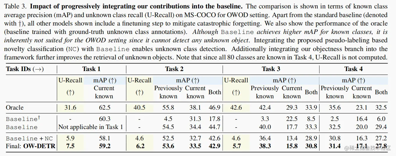 表3展示了逐步将作者的贡献集成到 OWOD 问题的 baseline 框架中的影响。