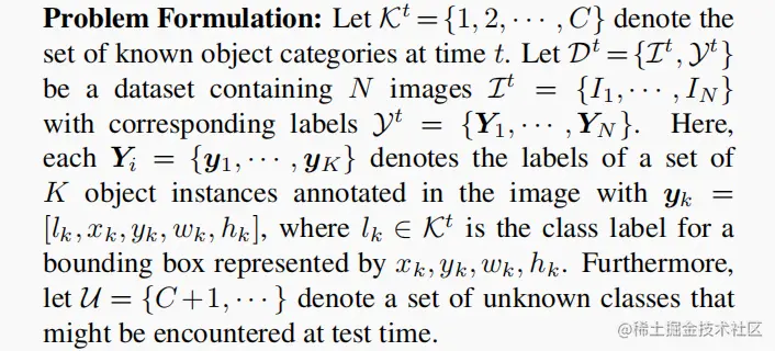 开放世界目标检测 (OWOD) 放宽了流行的基准测试中的封闭世界假设,在这种假设中,只有可见的类会出现在推理中。在 OWOD 范例中,在每个训练集里,模型学习检测已知目标的给定集合,同时还能够识别未知的目标。然后,这些标记为未知的信息可以转发给 oracle (人工标注器),它可以标注一些感兴趣的类。有了这些新的已知信息,模型将继续增量地更新它的知识,而不必从头开始对先前已知的类进行重新训练。这个迭代的学习过程在模型的生命周期中循环进行。