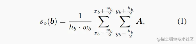 为了在训练集中没有任何对应注释的情况下学习检测未知目标,OWOD 框架必须依赖于选择出现在训练图像中的潜在未知实例,并在训练过程中将其作为伪未知类。ORE 的 OWOD 方法选择具有高目标性评分的 且 不与作为伪 ground-truth 的已知实例重叠的建议。从 two-stage 检测器 RPN 得到的这些建议很可能偏向于已知类,因为它是在已知类的强大监督下训练来的。而本文与这种策略不同的是,引入了一种自底向上的注意力驱动伪标注方法,该方案在 single-stage 目标检测器上具有更加好的泛化性和适用性。特征激活的幅度给出了在该空间未知存在目标的指示,因此可以用于计算窗口内目标的可信度。目标性评分 so(b) 可以用公式(1)进行计算。