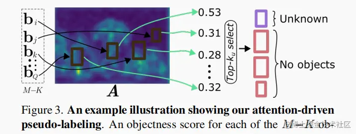 (2) 提出了一种注意力驱动伪标签方案,用于选择注意值较高但又不属于任何已知类的目标 query boxes 作为未知类;