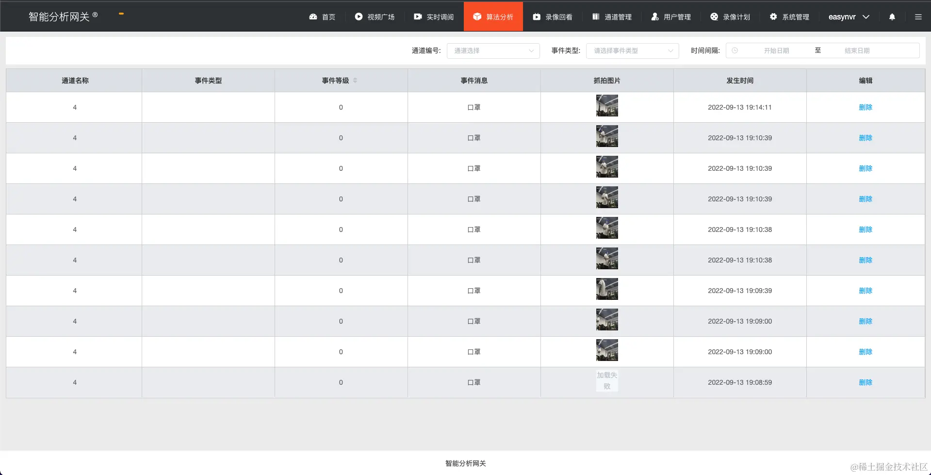 如图所示,在管理系统加入智能分析列表,并增加多类型的检索条件,可支持按通道、事件类型以及发生时间段进行检索。用户通过分析列表能更加直观地了解视频分析的过程及结果,包括当前通道、事件等级、事件消息等信息。