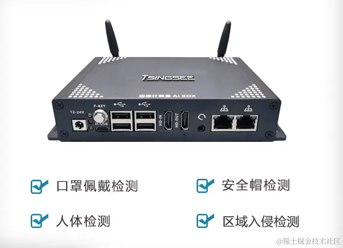 随着人工智能检测识别技术与视频处理技术的不断融合,应用场景也不断随之扩大,TSINGSEE青犀视频近期也发布了基于AI智能检测识别技术的硬件设备——智能分析网关。本设备内置多种AI算法,可对实时视频中的人脸、人体、物体等进行检测、跟踪与抓拍,支持人体检测、区域入侵检测、口罩佩戴检测、安全帽佩戴检测以及多种扩展算法。