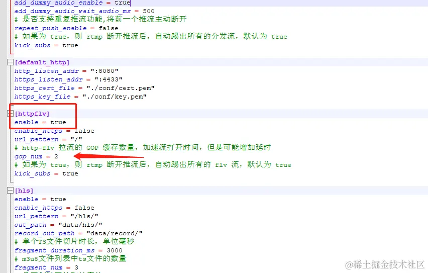 用户使用的是FLV的视频流,于是进一步查看其FLV的流媒体配置,发现增加了gop的缓存数量,因此导致了延时。若要想视频流畅不延时,可将gop_num字段参数改为0。