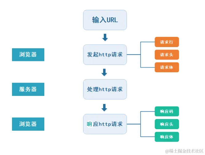 用户在浏览器输入URL访问时,发起HTTP请求报文,请求中包括请求行、请求头、请求体,服务器收到请求后返回响应报文,包括状态行、响应头、响应体。