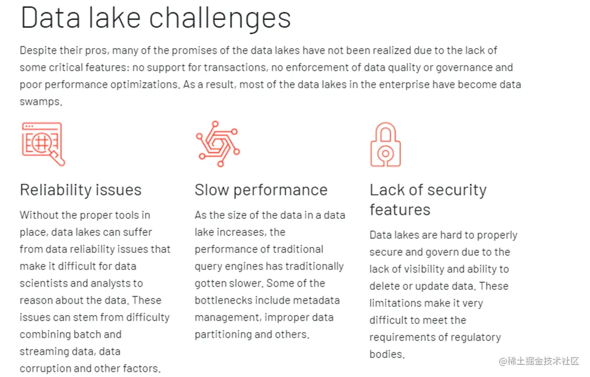 - 由于数据湖的上述特点,数据湖虽然容易落地,但随着湖中数据量的增多,一旦数据治理措施不善,数据湖容易退化为数据沼泽,数据质量低下,用户无法访问数据或不易找到需要的数据,整个数据湖的价值也就退化了;