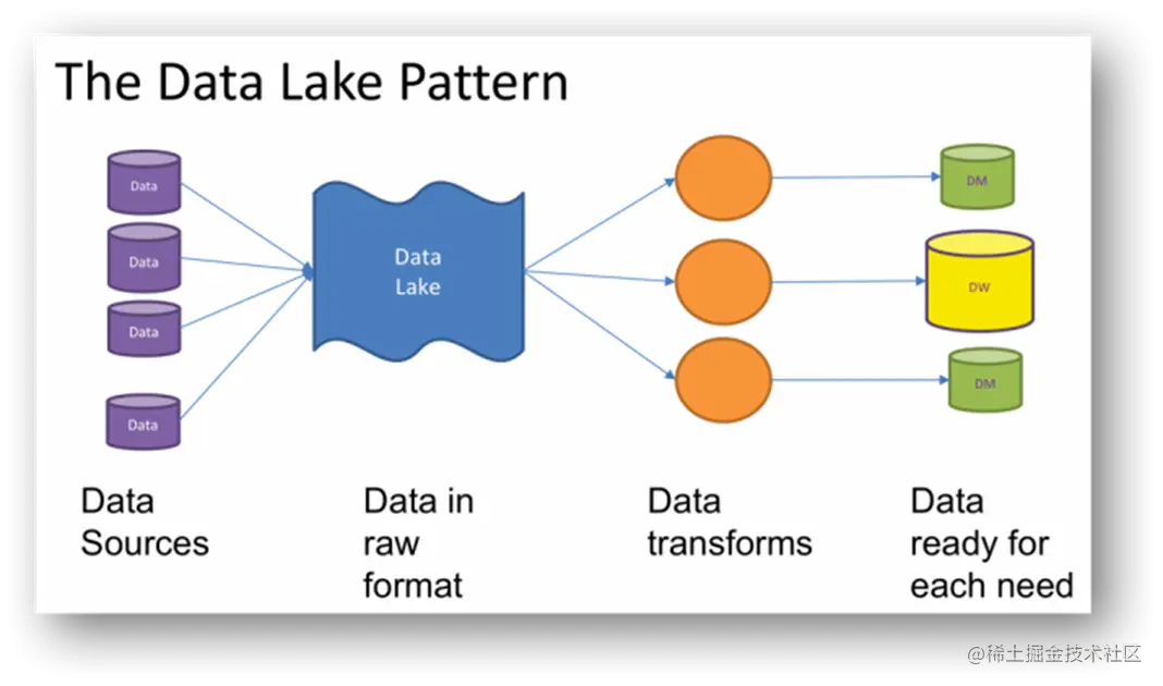 - 数据湖中的数据,在后续需要针对具体场景进行分析时,才会对湖中已经存在的原始数据进行 transform 转化到特定的结构进而进行后续分析,即采用的是 schema on read 而不是 schema on write;