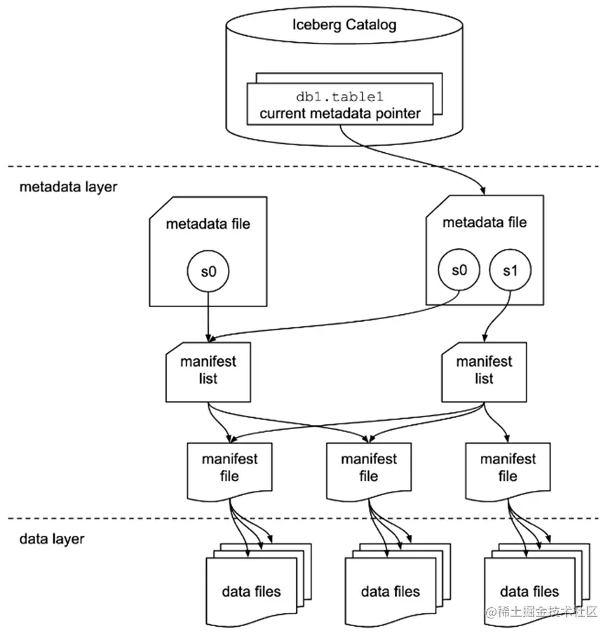 - 元数据层本身又是多层级的体系,包括:metadata file, manifest list, manifest file;