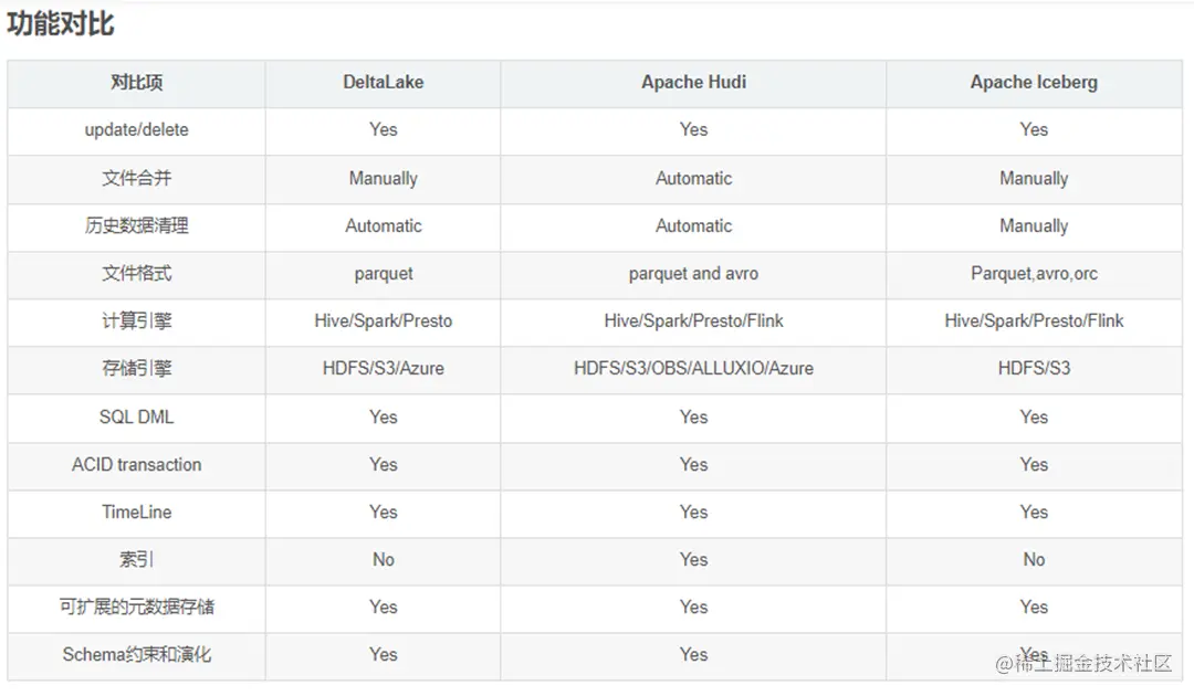 - 三者都提供了对多查询引擎的支持:如 Spark/Hive/Presto;