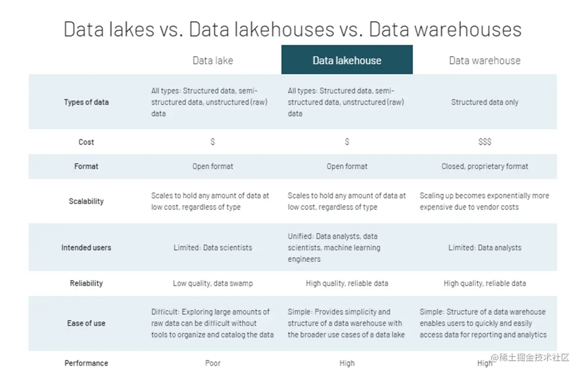 经过前面对数据仓库和数据湖的比较,我们可以看到,两者在设计上的根本分歧点是对包括存储系统访问、权限管理、建模要求等方面的把控:
