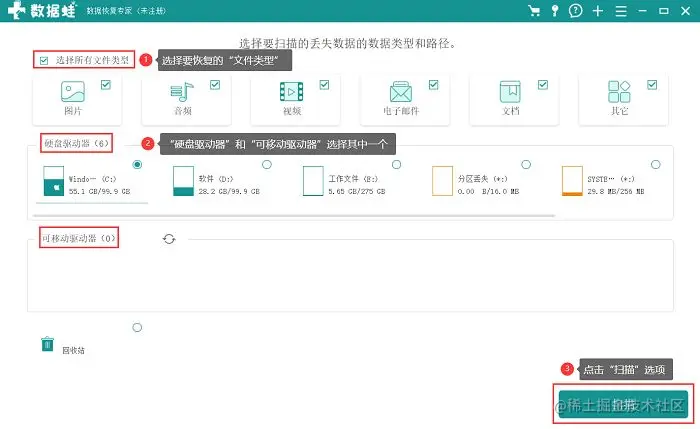 步骤1:安装好软件后,打开界面。选择要恢复的“文件类型”和“文件位置”,硬盘驱动器和可移动驱动器只能选择一个,其中硬盘驱动器里的选项可多选。点击“扫描”选项。