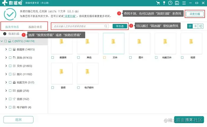 步骤2:在扫描结果的页面,在左侧你可以选择“按类型查看”或者“按路径查看”,查找到你需要恢复的文件。也可以通过“筛选器”里快速查找。如果快速扫描里没有找到你要恢复的文件,就可以选择“深度扫描”来查找,只是要花费比较长的时间来扫描,得出更具体的扫描结果。