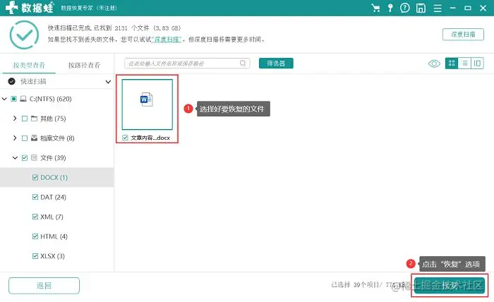 步骤3:选择好要恢复的文件,点击“恢复”即可。