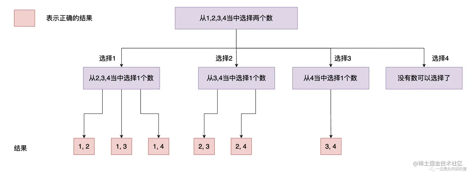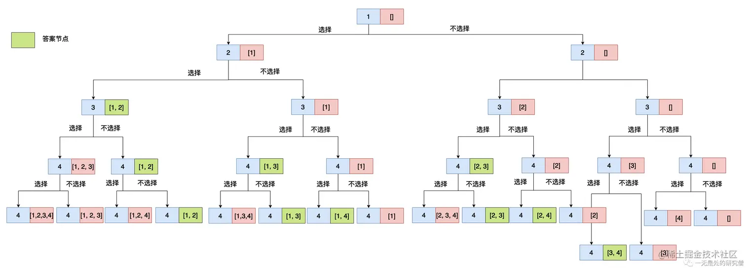 - 前面两个节点表示选择数据2得到的所有的结果,第二个节点之后的所有节点表示不选择2得到的结果。