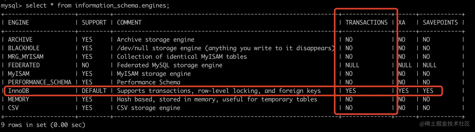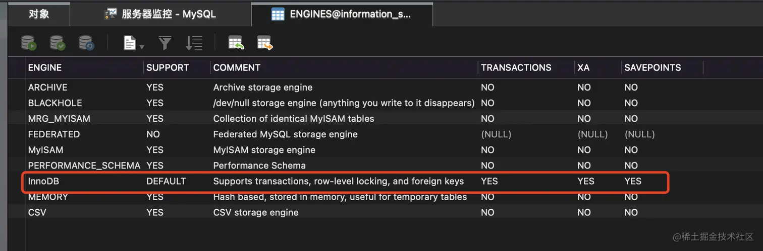 当然,你也可以从配置库中来查看存储引擎的支持情况,执行语句如下