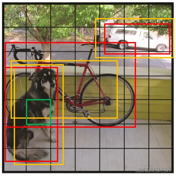 但 one-stage并不意味着YOLO去掉了生成候选框的步骤,而是将输入图像直接划分为 S×S 个网格(grid),取S =7,,即划分成 7×7=49 个网格,每个网格预测 B个边界框,取B=2,一共预测 49×2=98个边界框。
